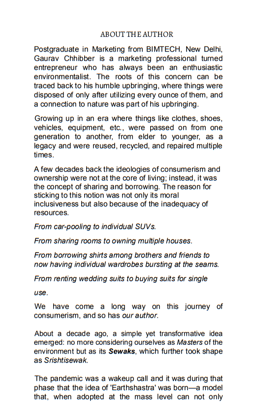 The journey of Earthshastra traces its evolution from earlier philosophy, Srishtisewak, which focused on serving the environment, not dominating it. It is a philosophy that reimagines the role of individuals in the grand tapestry of life on Earth. In this book, Gaurav explores the intricate relationship between human progress and environmental responsibility, offering a path that does not compromise on quality of life, but enhances it through conscious choices.
